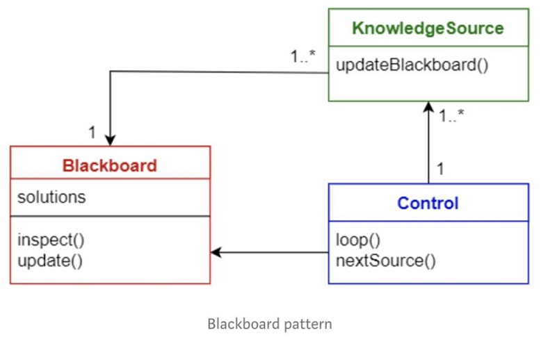 此模式对于尚无确定性解决方案的问题很有用,黑板模式由三部分组成: