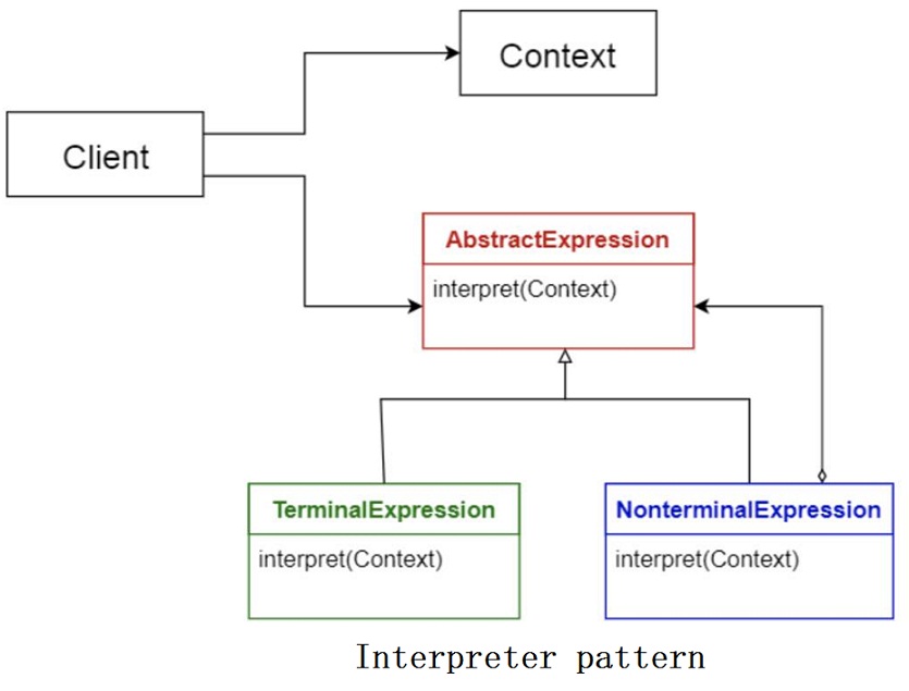 此模式通常用于设计组件来解释使用专用语言写出的程序,它主要指定如何估算程序行,即以特定语言编写的语句或表达式。基本思想是为每种语言符号都设计一个类。
