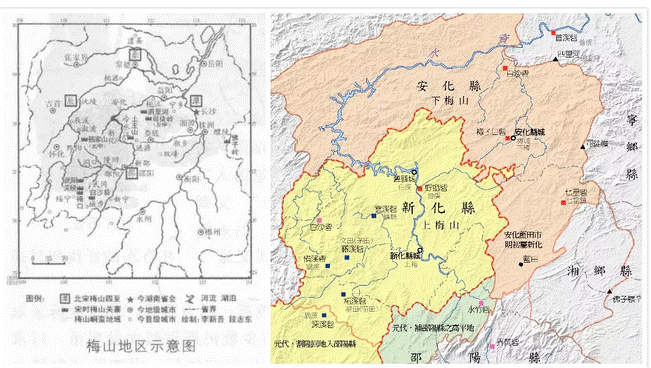 ▍左:梅山地区示意图;右:梅山地区最早设立于北宋熙宁年间的新化县和安化县