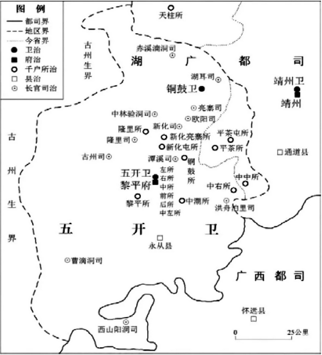▍明代湘黔桂三省交界亮江地区府、卫、司犬牙交错示意图