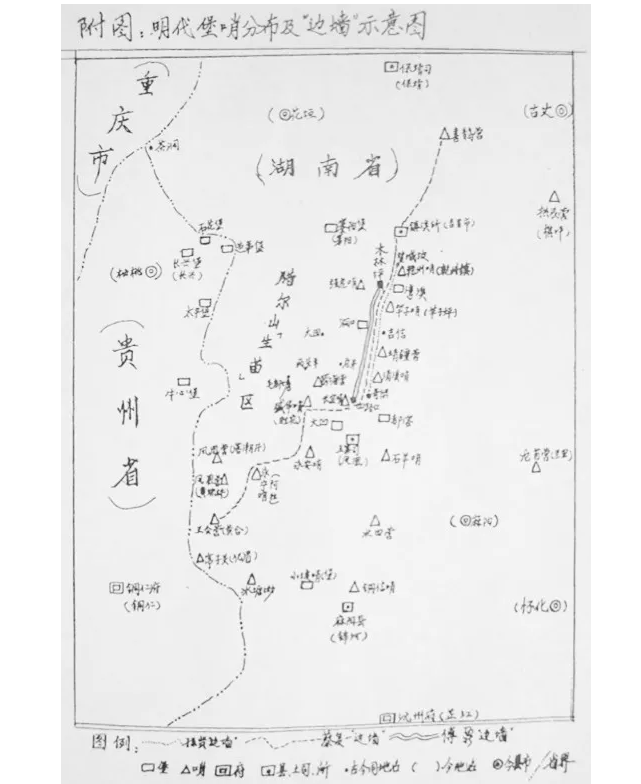▍由学者实地考察手绘而成的「边墙示意图」,清晰地展现明清两代苗疆「边墙」走向及堡哨分布