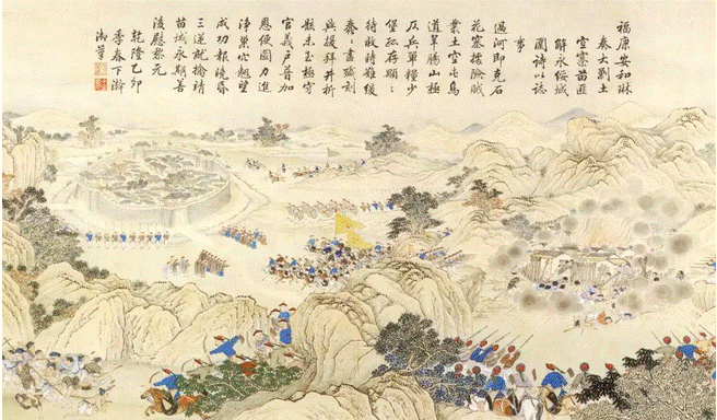 ▍反映乾隆末年清军镇压湘西苗人的《平苗图册·福康安与和琳进剿土空寨借永绥之围》图。而福康安、和琳二位乾隆朝重臣,都在征剿苗疆的军中病殁。