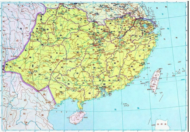 ▍《中国历史地图集》中的秦代「淮汉以南诸郡」图,将南方大片并未控制或只有松散控制的地区,标为同一种颜色