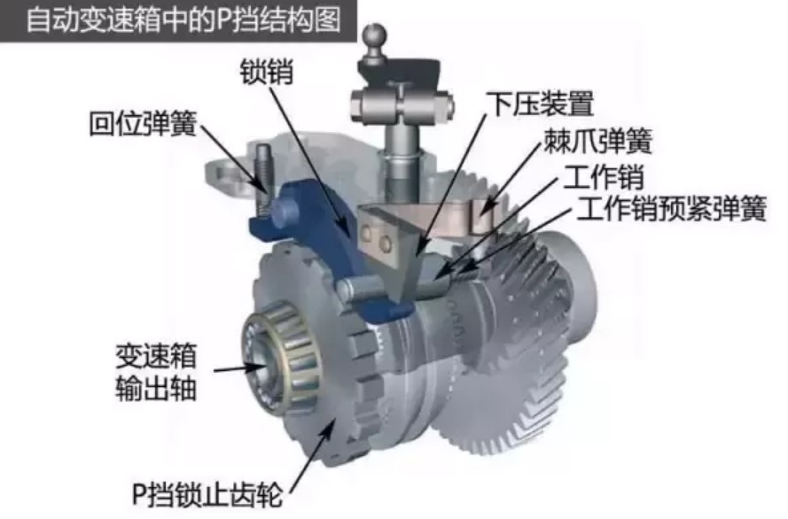 P挡主要有一个锁止齿轮以及一个锁止机构构成(图中的锁销、回位弹簧、下压装置、棘爪弹簧、工作销以及工作销预紧弹簧等)。