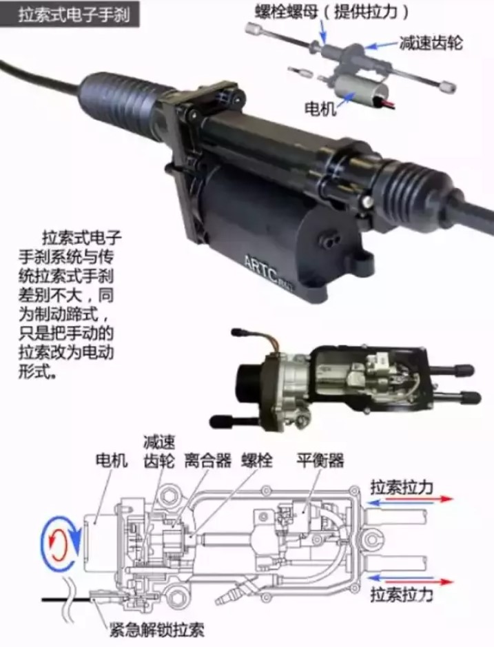 常见的电子手刹有拉索式与卡钳式两种。拉索式电子手刹与传统拉索式手刹差别不大 ,同为制动蹄式,只是把手动的拉索改为电动形式。