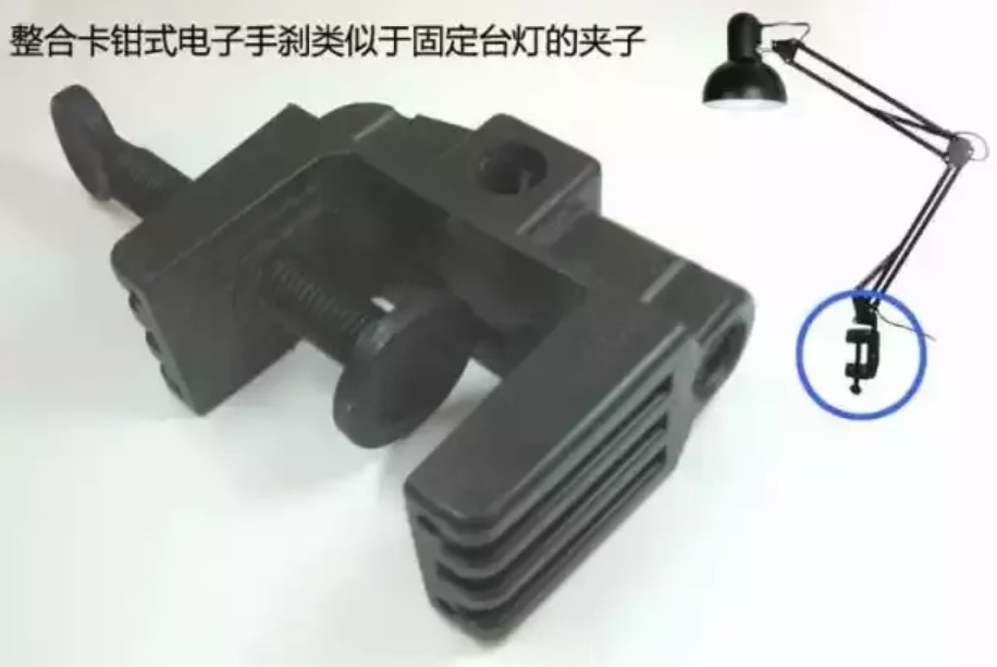 整合卡钳式电子手刹是通过整合在刹车壳体上的电机驱动压紧刹车盘来做到的。就类似于一种固定台灯的夹子。