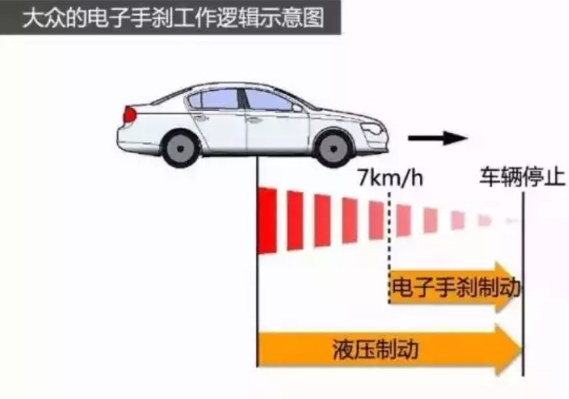 例如大众迈腾的电子手刹在7km/h以上的速度是就是先通过ESP控制单元以略小于全力刹车的力道对全部四个车轮进行液压制动。