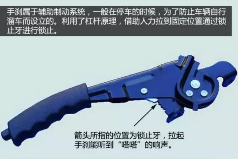 箭头所指的位置为锁止牙,拉起手刹能听到"嗒嗒”的响声.