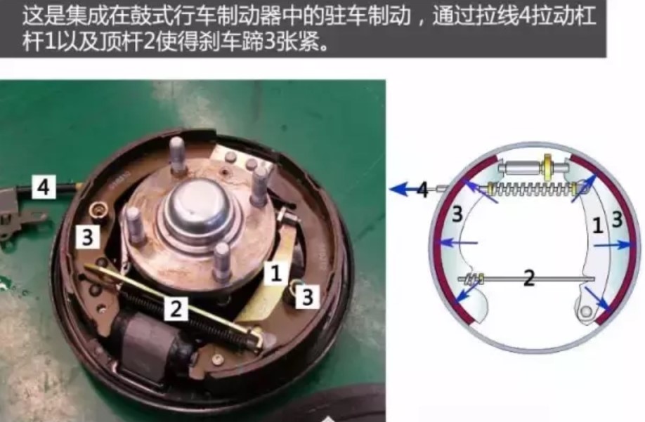传统的驻车制动器为鼓式较常见。鼓式驻车制动器分为两种,分别是集成在鼓式行车制动器中的驻车制动,通过下图中的“拉线4”拉动“杠杆1”和“顶杆2”使得“刹车蹄3”张紧刹车鼓。