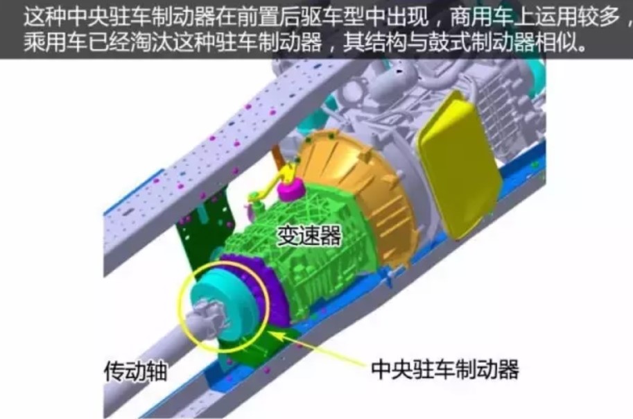 这种中央驻军制动器在前置后驱车型中出现,商用车上运用较多,乘用车已经淘汰这种驻车制动器,其结构与鼓式制动器相似。