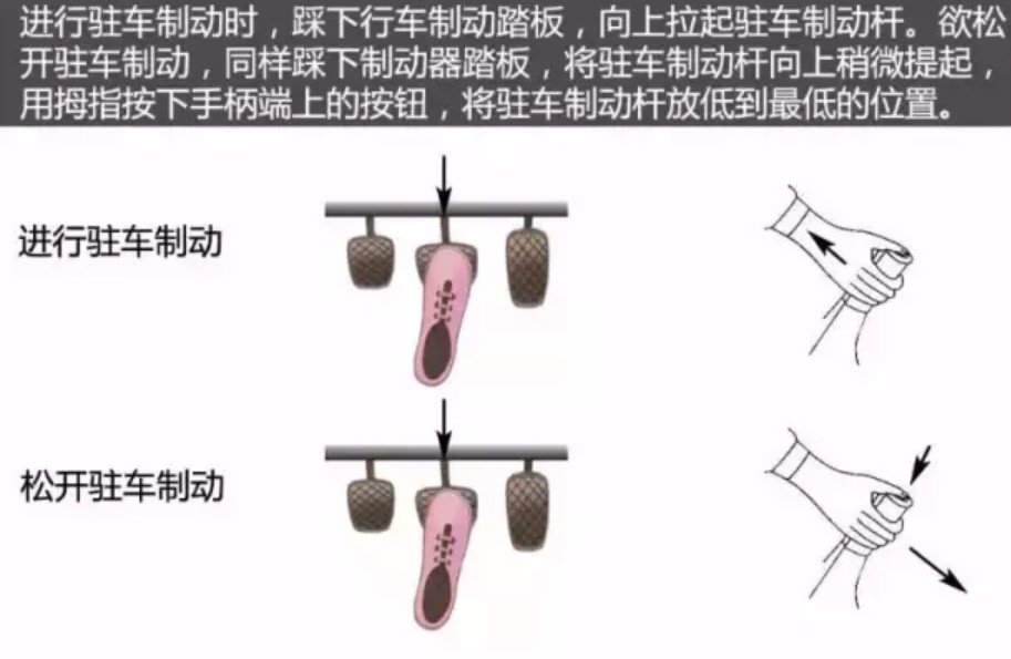 进行驻车制动时,踩下行车制动踏板,向上全部拉出驻车制动杆。欲松开驻车制动,同样踩下制动器踏板。
