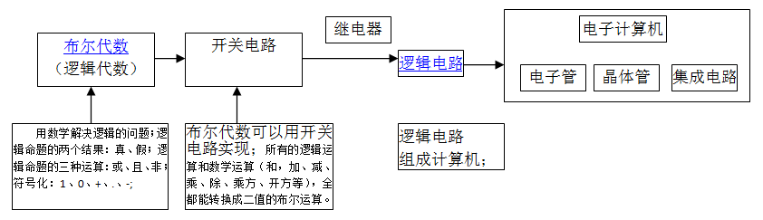 在布尔代数里,X代表一个命题,x=0表示命题为假,x=1表示命题为真,香农发现,如用x表示一个由继电器和普通开关组成的电路,那么x=0就表示开关合上,x=1就表示开关打开;接着,又阐述了串联电路和并联电路与逻辑学中联言命题和选言命题的一致性;