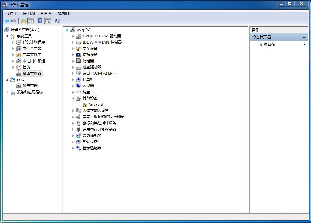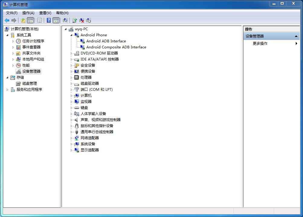 驱动安装完毕后,就可以看到“设备管理器“中Android USB设备的黄色感叹号已经去掉。