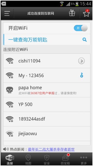 1.2 手机开启WiFi万能钥匙,连接一个热点;