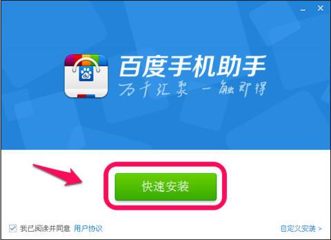 1、下载百度手机助手后,点击打开安装,点击快速安装,一键完成,如图。当然,你也可以选择右下角的自定义安装,总之,