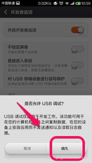 3、进入后,看到USB调试的选项,开启,如果你的没有开启的话,点击,如图。