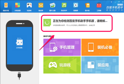 5、这时候,打开电脑端的百度手机助手,我们就会看到“正在为你检查百度手机助手手机版”,如果你手机没有安装,会自动下载到手机,你切换到手机,点击安装即可。