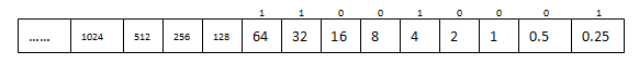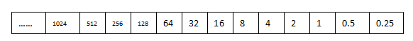 首先,在表格里写出在二进制里,每个位表示的整数的数值。比如,在上图里,第0位表示1,第1位表示2, 第2位表示4,第3位表示8,......,-1位为0.5,-2位为0.25,-3位为0.125,第N位表示的值为2^N。对于一个整数X, 首先在表格中找到比X小的最大数,比如如果X为100,那么在上面的表格里,比X小的最大数就是64, 所以,X在二进制中,此位为1;然后,用X减去该数,从右边表格里继续找比剩下小的最大数。一直到X最后变为0。