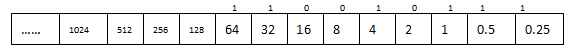 2进制转化为10进制,同样可以用表格法,分别将各个位对应的值相加,就可以得到对应的十进制。比如,对于二进制:1100101.11,其中各位对应的值为: