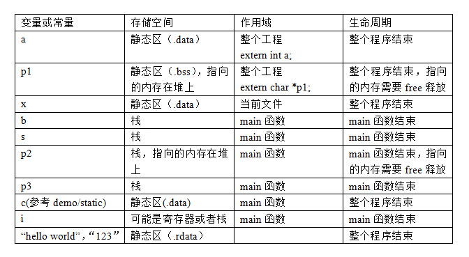 习题:分析下列程序中每个变量的存储位置,作用域,与生命周期