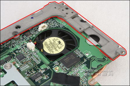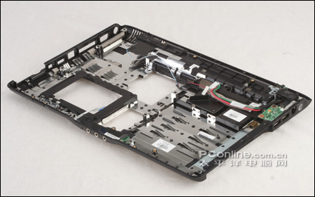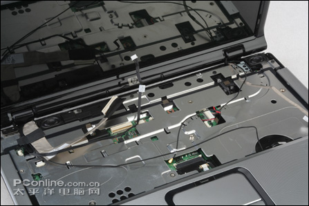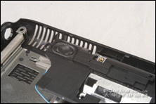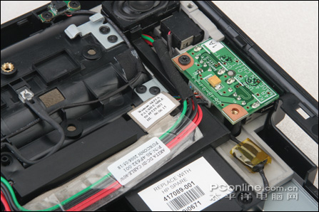 小结一下主板上方的布局,由于音响、电源线、指示灯等等都分布得比较分散的关系,外接的线路比较多。还好集中在主板右边,所以不会给人感觉还是井井有条的。其实,内部的复杂布局在一定程度上是为了符合用户的使用习惯,以及满足更多的人性化设计需要。例如,DV2000的电源插孔是发光(蓝光)的,这种通电后要发光的工艺就比普通的笔记本插孔复杂一些,这也是电源线比较复杂的原因之一。