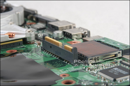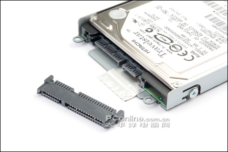 为了节省硬盘装拆时候的活动空间,主板上的硬盘接口与众不同。这种与众不同的接口能够使硬盘能够在垂直方向插拔,而一般的笔记本电脑则需要硬盘座上预留一定的空间,以便让硬盘从水平方向上插拔。当然,这种设计就需要在硬盘上加装转接模块了。