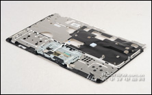 进一步卸开主机的上面板,我们会发现铝板和腕托部分是完全整合在一起的。铝板会接触到主板的地方,都有绝缘胶纸覆盖。
