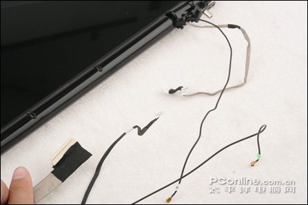 铝板上的线路分布比较复杂,分别有LCD数据/供电线、摄像头数据线、MIC数据线、无线网卡天线。由于线路分布比较复杂,拆开之后给人一点凌乱感,但是铝板上都有对应的卡扣来固定这些数据线。