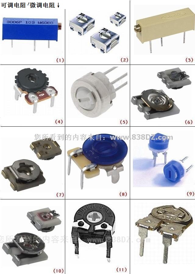 ↓图1、9 普通电阻;图2 电阻排;图3 、5 贴片电阻;图4、10 水泥电阻;图6 功率电阻;图7 变阻器;图8 柱形贴片电阻;图11、12 光敏电阻
