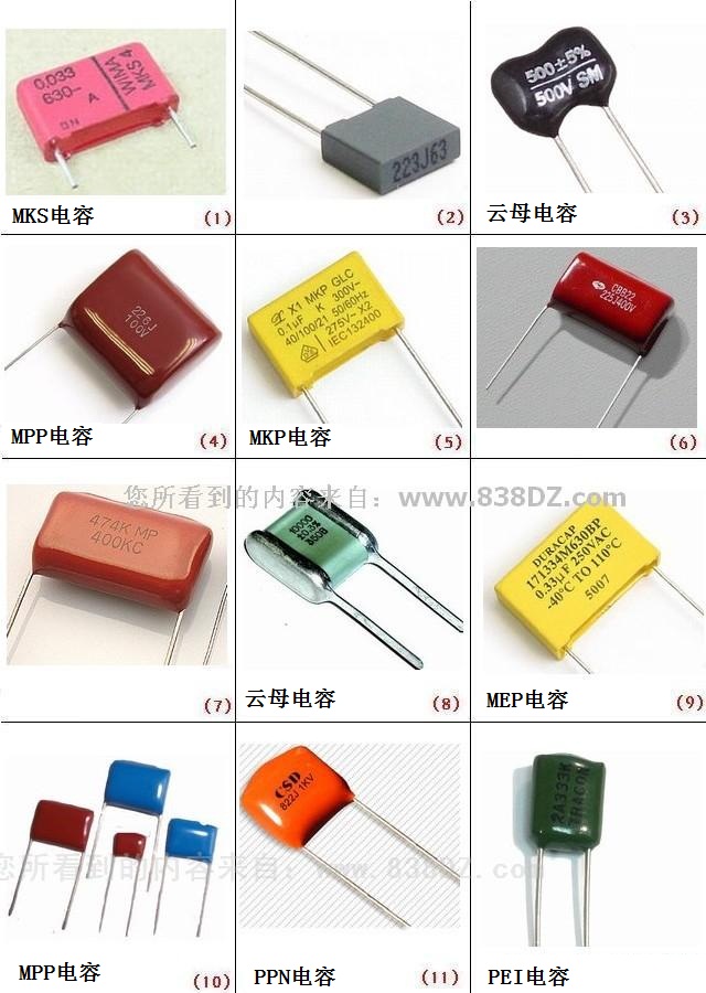 ↓图1 MKS电容;图2 瓷片电容;图3、4 MKP电容;图5 贴片电解电容;图6 史普瑞电容 Sprague Orange Drop Capacitors;图7 电机用电容;图8 MKT电容;图9 陶瓷电容