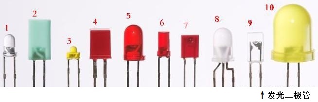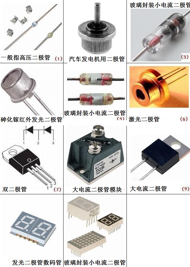 ↓图1 一般指高压二极管;图2 汽车发电机用二极管;图3、5 玻璃封装小电流二极管;图4 砷化镓红外发光二极管;图6 激光二极管;图7 双二极管;图8 大电流二极管模块;图9 大电流二极管;图10、11 发光二极管数码管