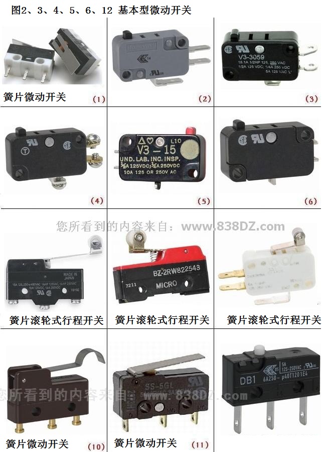 ↓图1、10、11 簧片微动开关;图2、3、4、5、6、12 基本型微动开关;图7、8、9 簧片滚轮式行程开关
