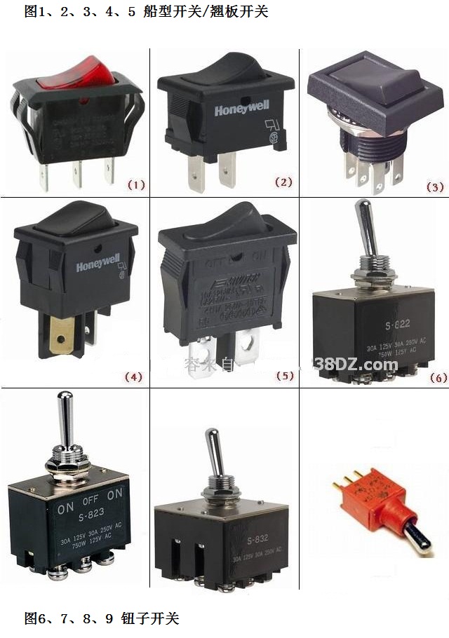 ↓图1、2、3、4、5船型开关/翘板开关;图6、7、8、9钮子开关