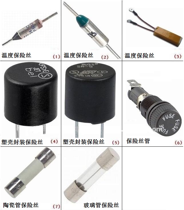 ↓图1、2、3 温度保险丝;图4、5 塑壳封装保险丝;图6 保险丝管;图7 陶瓷管保险丝;图8 玻璃管保险丝
