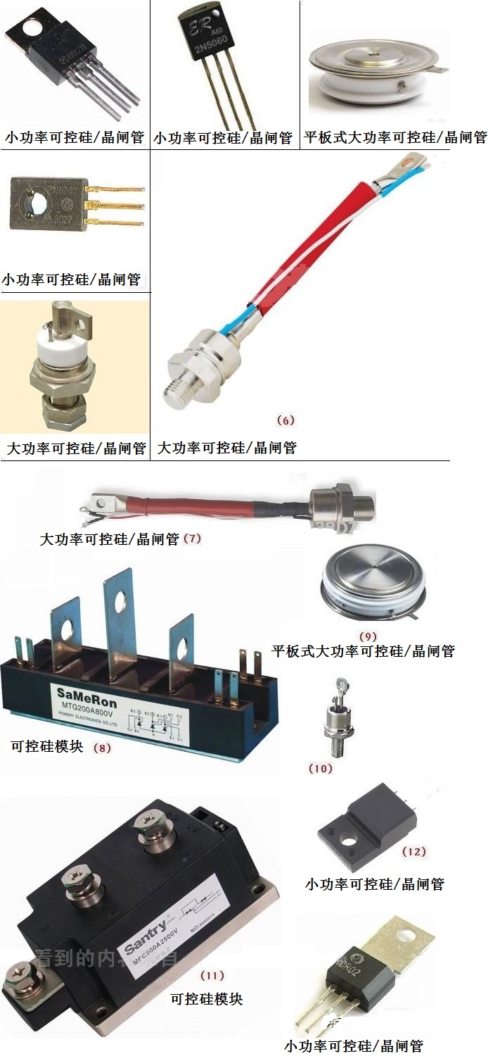 ↓图1、2、4、12、13 小功率可控硅/晶闸管;图3、9 平板式大功率可控硅/晶闸管;图5、6、7 大功率可控硅/晶闸管;图8、11 可控硅模块