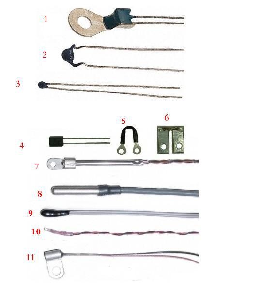 ↓图1、2、3 热敏电阻温度传感器;图4、6、7、8、9、10 树脂封装热敏电阻;图5 玻璃封装热敏电阻;图11 二极管形热敏电阻