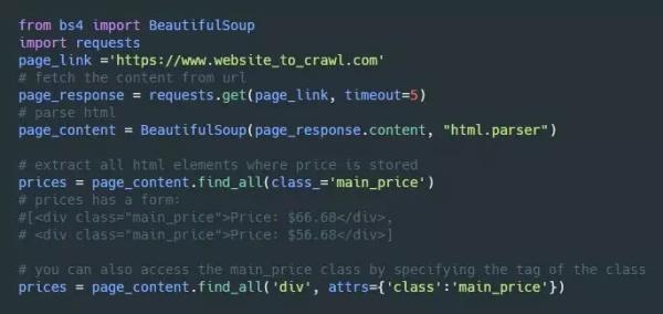 于是,我们从最基本的代码开始:先导入需要用的 BeautifulSoup 和 Requests 库,然后发起查询请求( requests.get() ),接着处理 html 源码,最后找到所有 class 为 main_price 的元素。