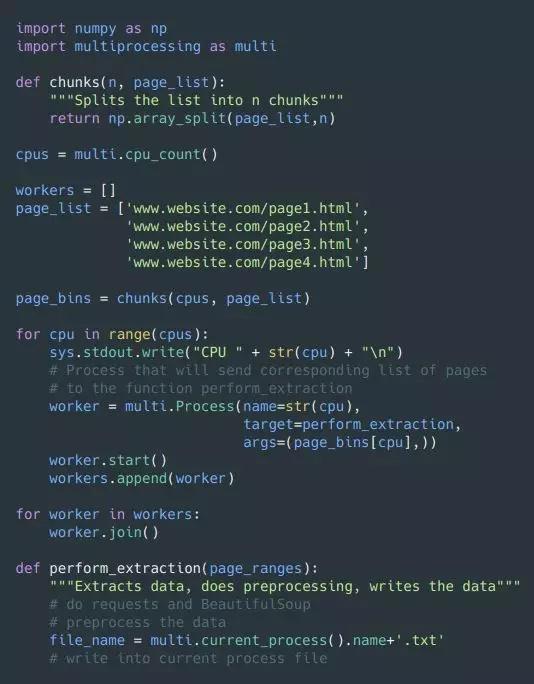 假设我们有100个页面要发起请求,我们希望给将任务量平均分给每个处理器。假设你有 N 个 CPU,你可以把所有的页面分成 N 个部分,每个 CPU 处理一个部分。每个进程都将有自己的名字,目标函数以及需要处理的参数。每个进程的名字可以在之后被调用,以便将获取到的信息写入具体的文件中。