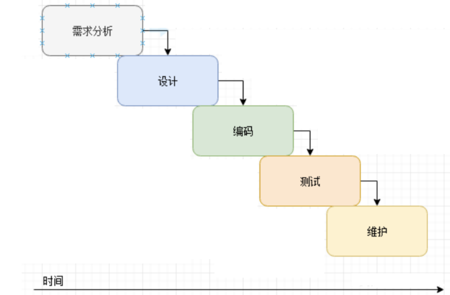首先,瀑布模型的开发方式是线性开发,也就是必须是上一个阶段完成以后且审核通过才能进入到下一个阶段。
