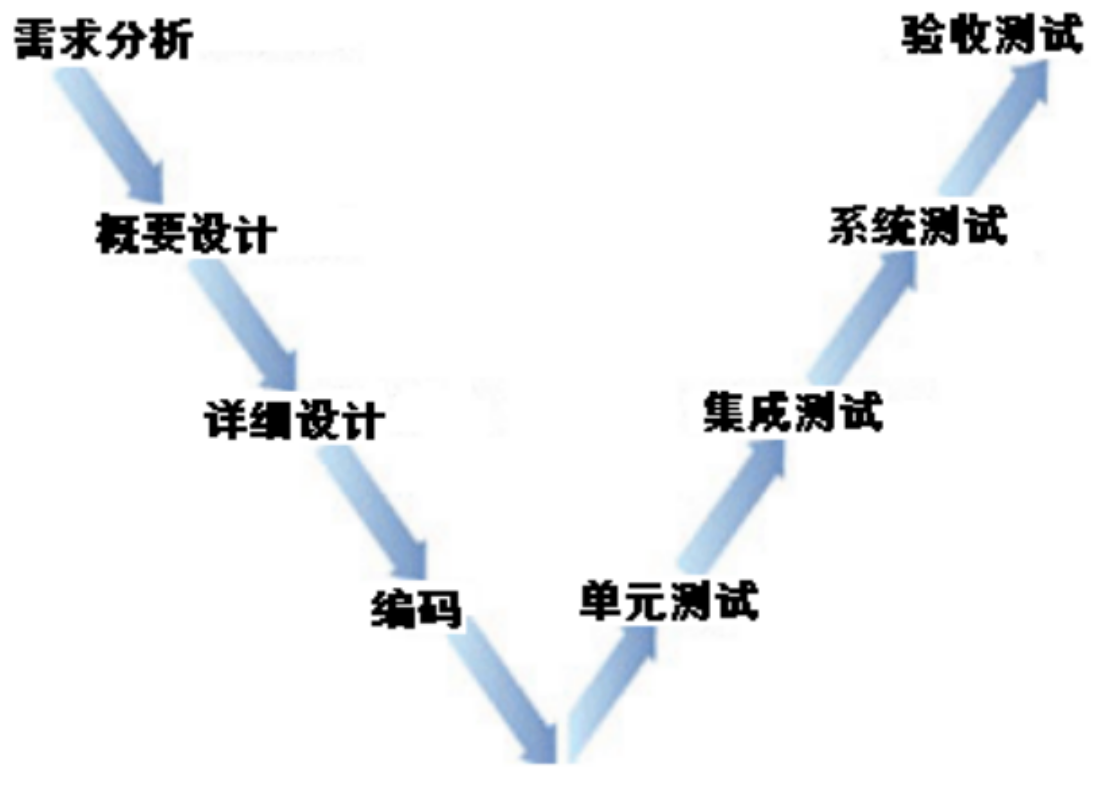 V模型主要包含的阶段有: 需求分析->概要设计->详细设计->编码->单元测试->集成测试->系统测试->验收测试
