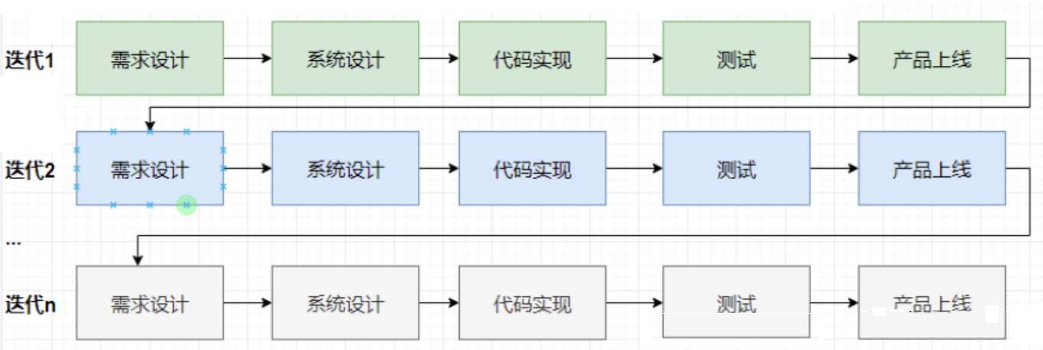迭代模型包含的阶段有: 需求设计->系统设计->代码实现->测试->上线