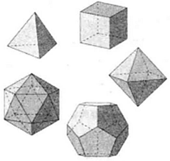 仅有的五种正多面体,即是正四面体、正六面体、正八面体、正十二面体和正二十面体。
